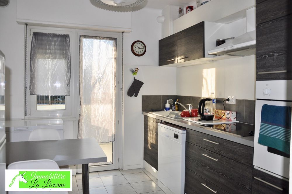 Depuis la cuisine vous avez un accès direct au balcon, celle-ci est équipée, plaque de cuisson et four, emplacement pour un lave-vaisselle. D’une salle de bain (baignoire et lavabo). Et de toilettes séparées avec lave main.